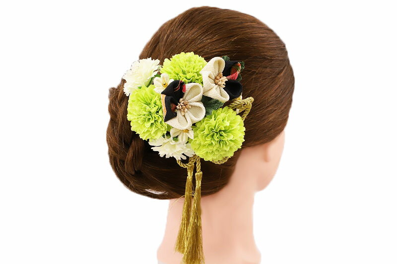 髪飾り 成人式 振袖 浴衣 卒業式 袴 結婚式 2点セット 黄緑 白 花 和 洋 かんざし 手作り 簪 つまみ細工 ちりめんフォーマル 花飾り 玉飾り ブライダル W 58 304-226 黄緑 白 p762 Si